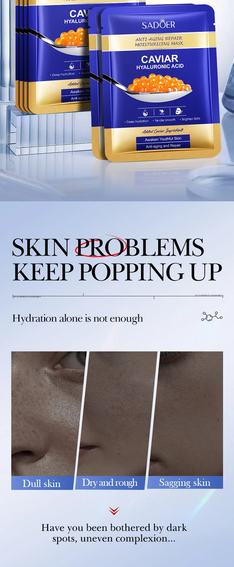 Transform your skin with these luxurious SADOER caviar and hyaluronic acid face masks - your premium solution for deeply hydrated, brightened, and firmer, more youthful-looking skin!
